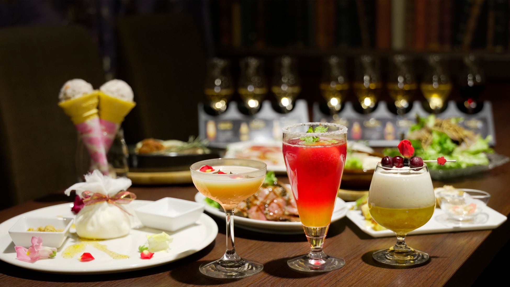 コース料理の〆スイーツとして、チーズクリームの中に梅ジュレを包んだ、新感覚のさっぱり濃厚なチーズケーキ「梅の半生スイーツ クレームダンジュ」。カットすると中から梅ジュレがトロッと流れ出ます。アクセントに添えた塩とシュトロイゼルで味変もお楽しみいただけます。〆のミクソロジーノンアルコールカクテルとして、梅の酸味を効かせつつジュニパーベリーやグローブ、ジャスミンなど女性にうれしいスパイスやハーブをアクセントにした「Rapunzel(ラプンツェル)」、梅シャーベットと紫蘇ジュースのコントラストが鮮やかな「紫蘇香る梅スカッシュ」、梅と相性の良いマンゴーにヨーグルトを組み合わせた「梅マンゴーラッシー」の3種類をご用意しました。