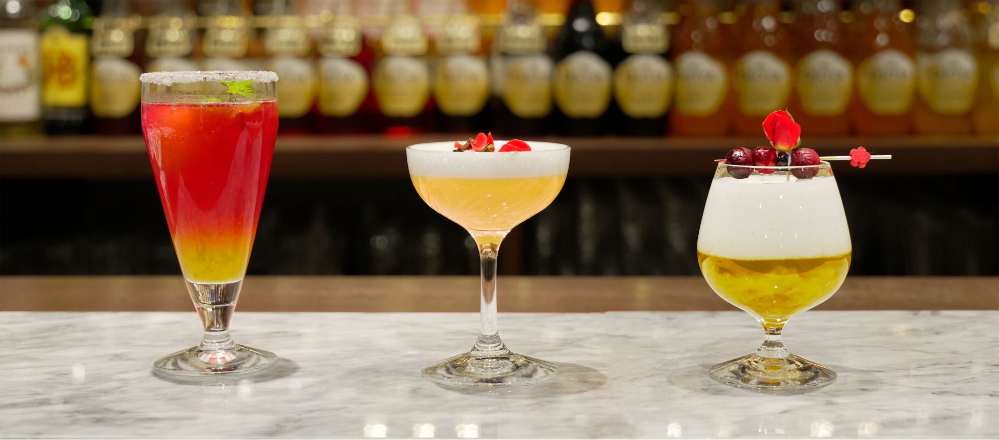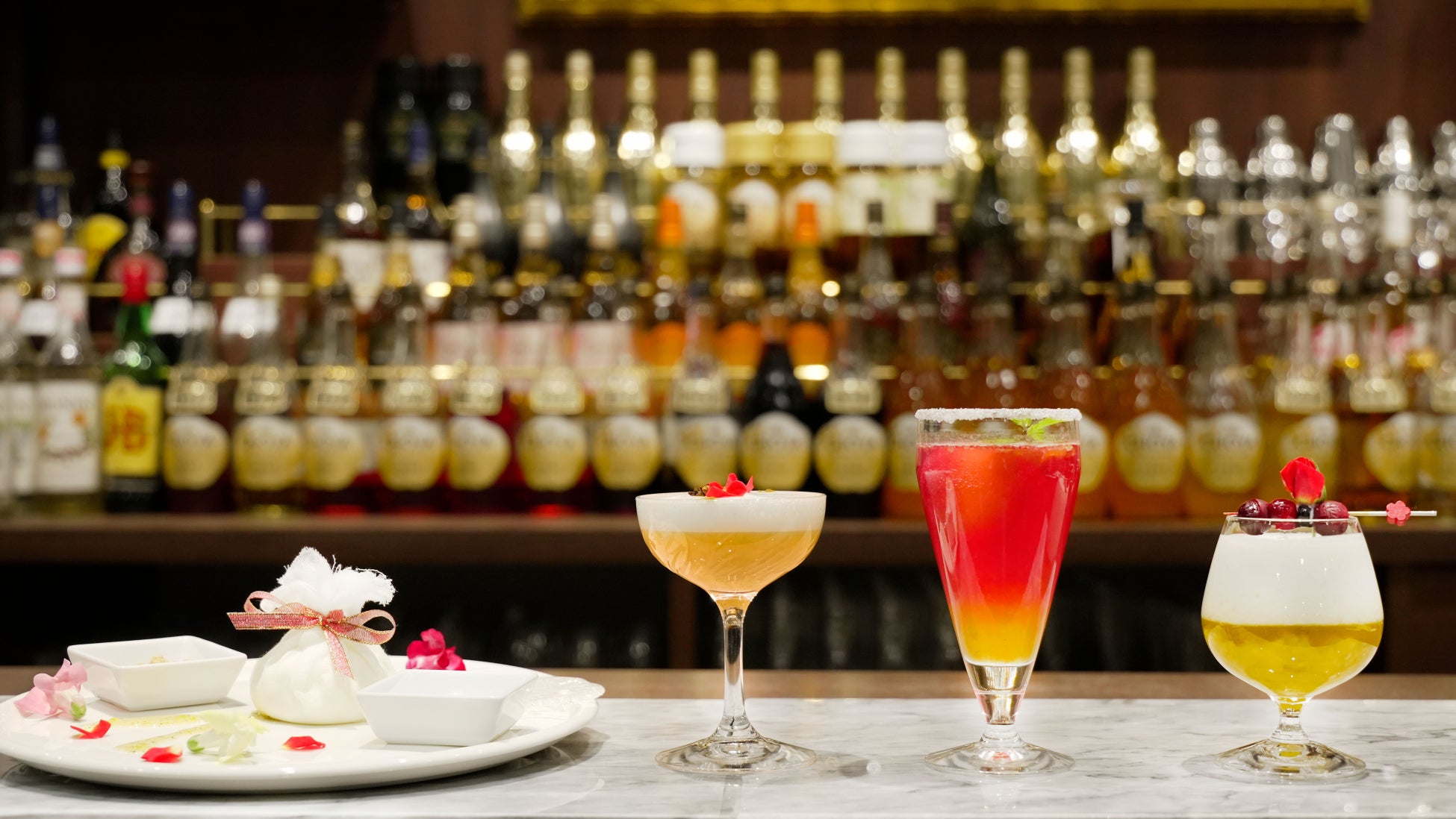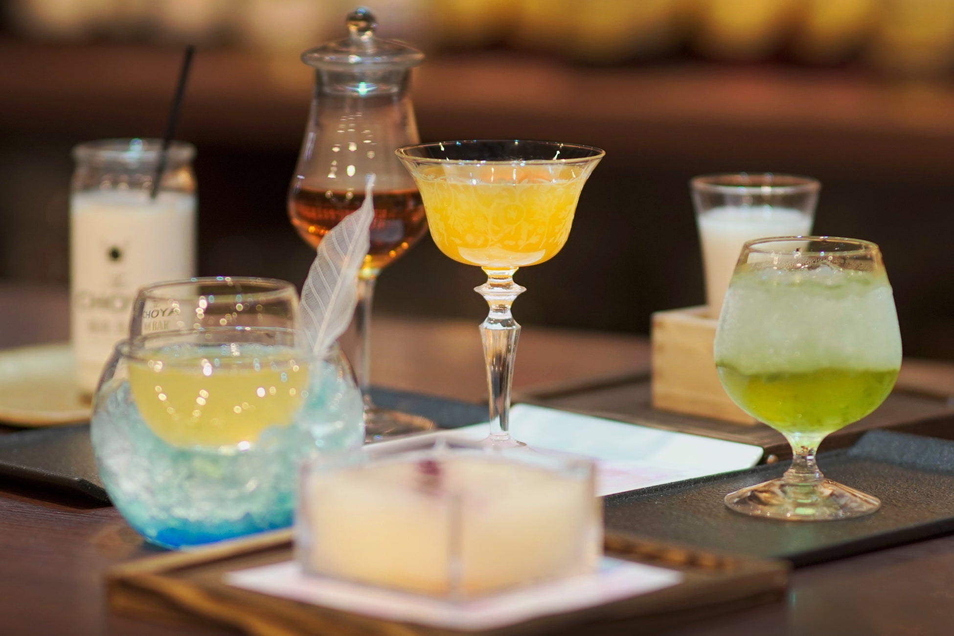 神水(The CHOYA、日本酒、ヨーグルトリキュール)・梅煙香(The CHOYA、イタリアンベルモット、シェリー酒)・ショコラティーニ(The CHOYA、チョコレートリキュール、生クリーム)など