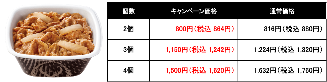 内容:テイクアウトの牛丼並盛を2個、3個、4個購入時にキャンペーン価格で提供します。