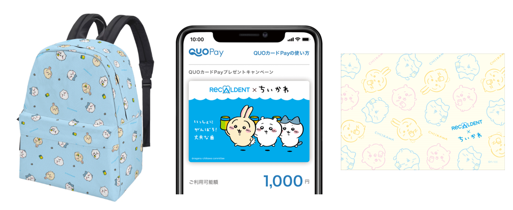 LINEでリカルデントの公式アカウントを友だち追加して、キャンペーン期間中にリカルデントを購入したレシートを送ると、ちいかわオリジナルコラボグッズが当たるチャンス!ちいかわとボトルが描かれた、お出かけしたくなるリュックや、会社でもお家でも活躍できるブランケット、QUOカードPayなど日常で使えるグッズをご用意しました。