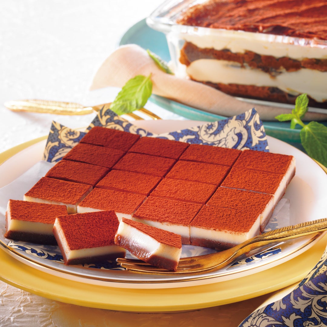 イタリアで生まれたデザート「ティラミス」をイメージした生チョコレート。マスカルポーネチーズのパウダーを入れたホワイトチョコレートのガナッシュと、コーヒーとコーヒーリキュール入りのガナッシュを2層に重ね、ココアパウダーをかけました。チーズのコクとコーヒーの味わいが、それぞれ引き立ちながらもとけ合い、まるでティラミスを食べているかのような風味が広がります。