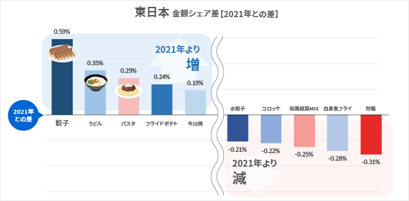 東日本では餃子が圧倒的増、”主食系”商品の上昇が明らかに