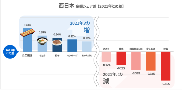 2021年の冷凍食品商品別の金額シェアと2022年を比較したところ、西日本で最も増加した冷凍食品はたこ焼き(0.41%増)となり、次いでうどん(0.28%増)餃子(0.24%増)と “粉もの”商品が伸長しています。一方、2021年に比べ最も減少した商品は炒飯(0.82%減)、次いでからあげ(0.33%減)と冷凍食品の定番が減少する結果となっています。
