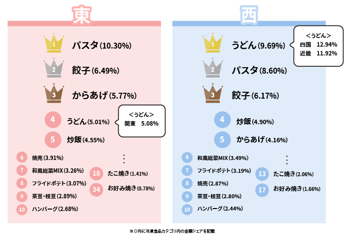 豊富なラインナップに加え手軽に調理できることから、お弁当のおかずや食卓の一品として需要が高い冷凍食品ですが、2022年の年間売上金額を東日本、西日本のエリア別に比較したところ、両エリアともにパスタ・うどんといった麺類が1位となりました。西日本エリアでは、第1位うどん、第2位パスタの金額シェアを合わせると約18%と全体の約2割を麺類が占めています。さらにうどん金額シェアを地域別に見てみると、四国地方は全体の約13%・近畿地方は約12%と極めてうどんニーズが高く、関東地方(約5%)と比較すると倍以上という結果になりました。一方東日本では、餃子やからあげ(全体の約12%を占める)といった”おかず系商品” がランクインしており、おうち時間増加に伴う家飲み時にも冷凍食品が活躍しているようです。さらに10位以下を見てみると、西日本ではたこ焼き、お好み焼きが20位圏内に入るなど、冷凍食品においても”粉ものグルメ”の人気は健在です、調理・加工技術の進化や市場拡大により、2023年も冷凍食品の盛り上がりが期待されます。