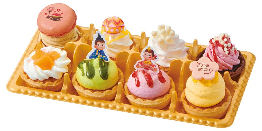 国産黄桃ショートケーキ、ハイカカオチョコレートのケーキ、あまおう苺のケーキ、熊本県産和栗のケーキ、北海道産クリームチーズのケーキ、宇治抹茶のケーキの6種類の味が楽しめるアソートケーキです。ひなまつりのチョコアタッチメントとマカロン皮、ペコちゃんとポコちゃんをデザインした巻き帯で、かわいい見た目も楽しめます。