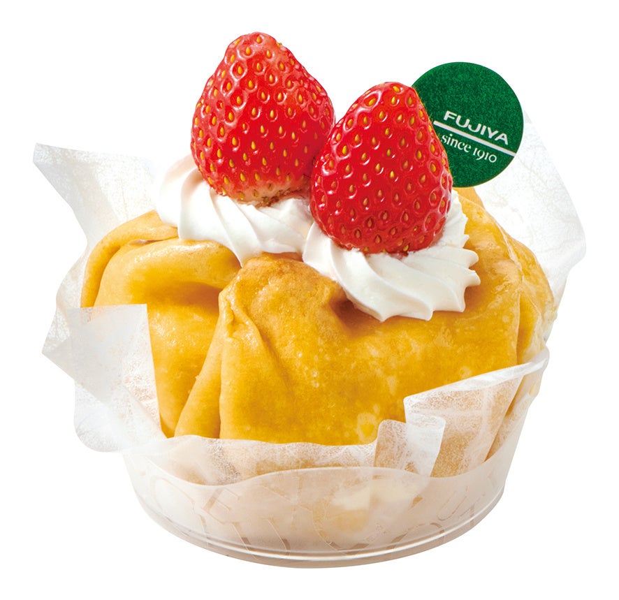 ふわふわのシフォン生地と黄桃のシロップ漬け、オレンジソース、軽いタイプのカスタードクリームをクレープ生地で包みました。上面はプレミアムシャンテリークリームと苺で飾り付け、上品でかわいらしく仕上げています。