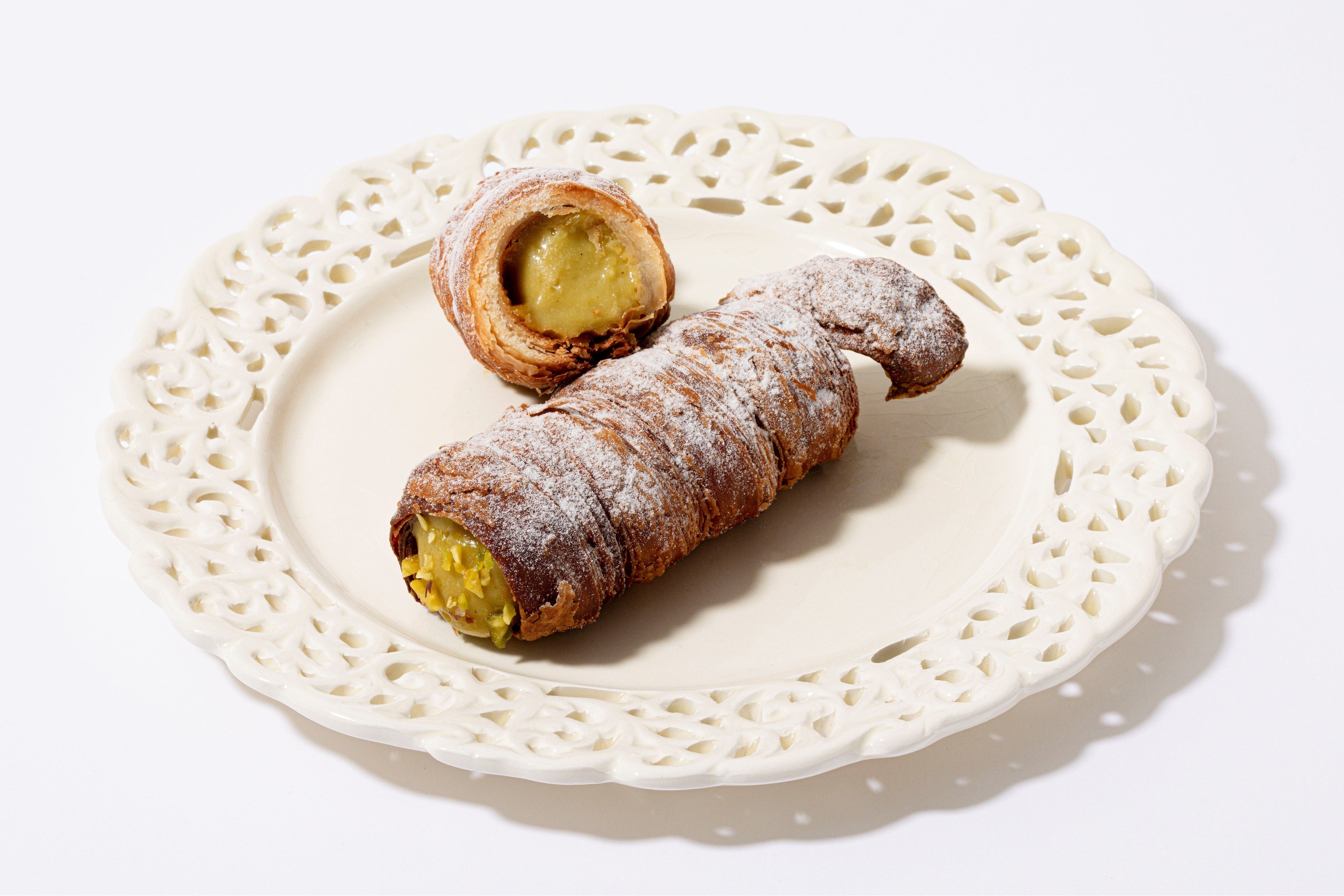 サクサク香ばしいパイ生地に特製クリームをたっぷり詰めたクリームホルンです。季節限定で味わえるピスタチオカスタードは、ピスタチオを贅沢に使ったコクのあるクリームに、ローストピスタチオの食感がアクセントです。