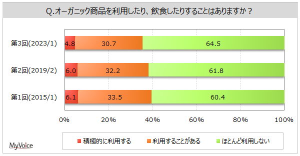 | <今 回>(2023/1)https://myel.myvoice.jp/products/detail.php?product_id=29408 ※上記設問の他に「購入したいオーガニック商品のジャンル」も聞いています。 <第2回>(2019/2)https://myel.myvoice.jp/products/detail.php?product_id=24706 <第1回>(2015/1)https://myel.myvoice.jp/products/detail.php?product_id=19809 |
