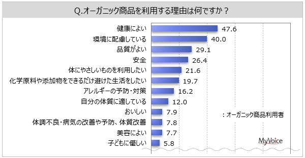 オーガニック商品を利用する理由は(複数回答)、「健康によい」が利用者の47.6%、「環境に配慮している」が40.0%、「品質がよい」「安全」が各3割弱です。