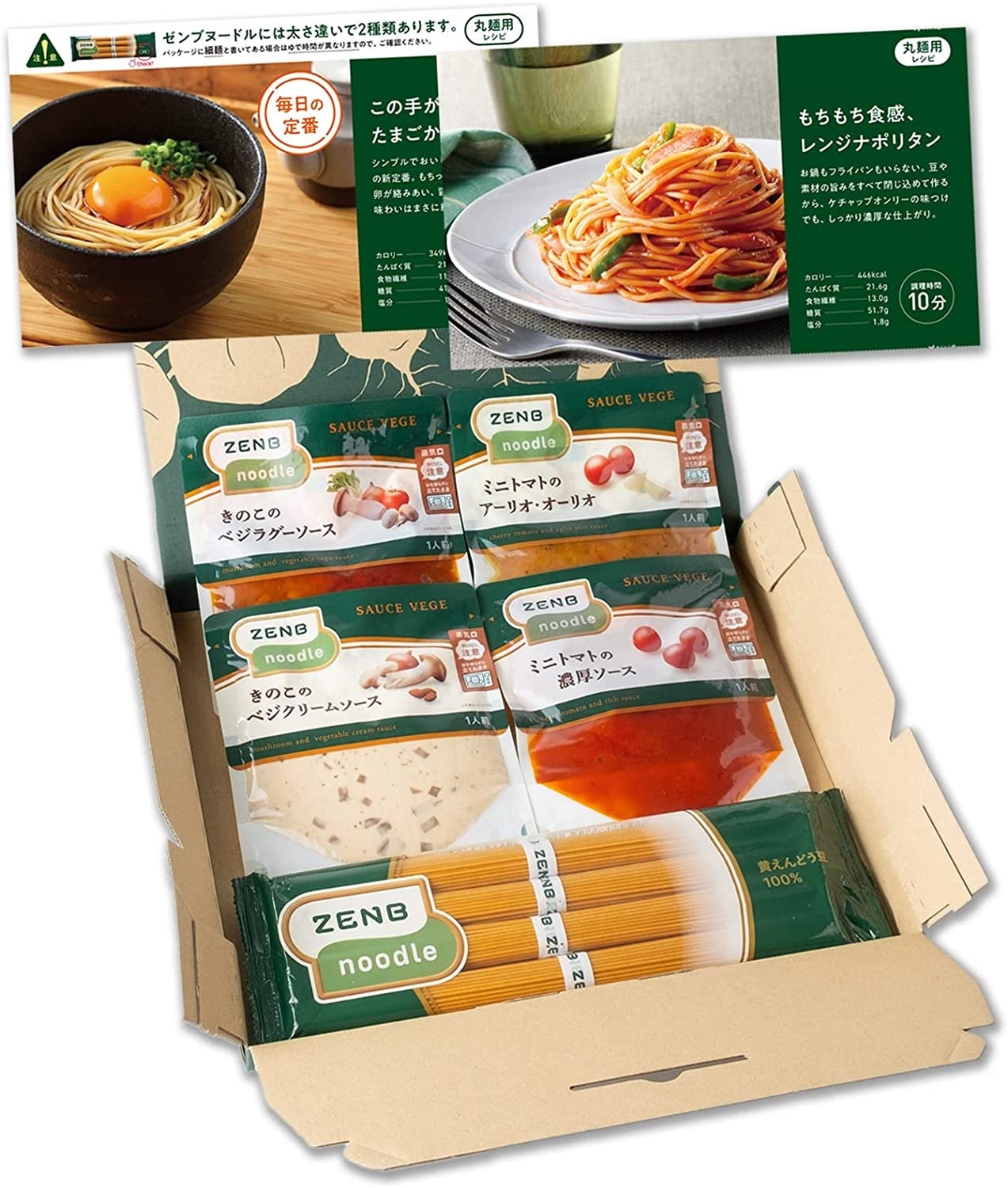 ZENBヌードル1袋、パスタソース4袋(ミニトマトの濃厚ソース、ミニトマトのアーリオ・オーリオ、きのこのべジクリームソース、きのこのベジラグーソース 各1袋)