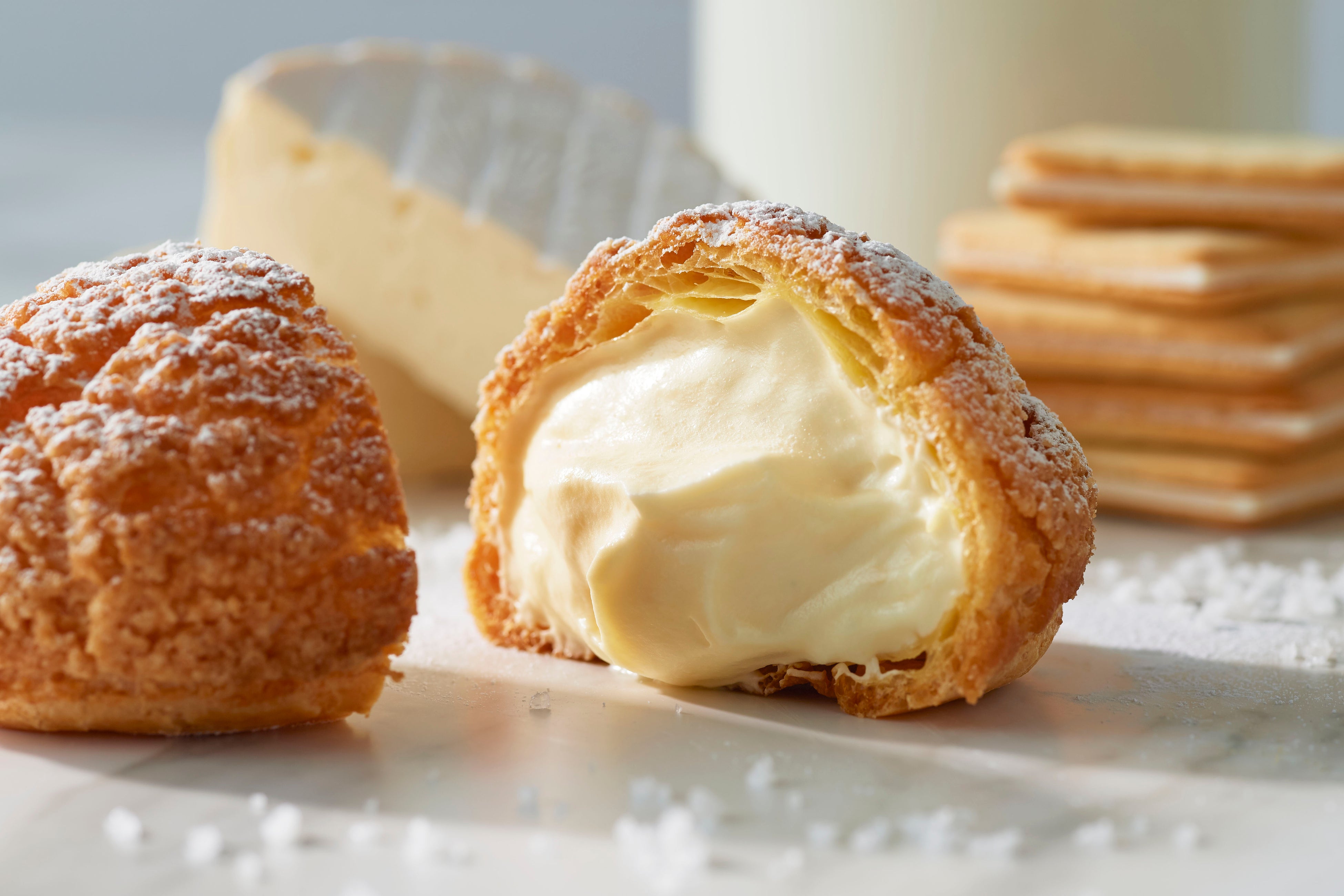カマンベールチーズクッキーをのせて焼き上げたシュー⽣地に北海道産マスカルポーネとカマンベール、こだわりの⽣クリームをブレンドした自家製チーズクリームをたっぷりと詰め込んだ、チーズ好きにはたまらないチーズリッチな味わいです。