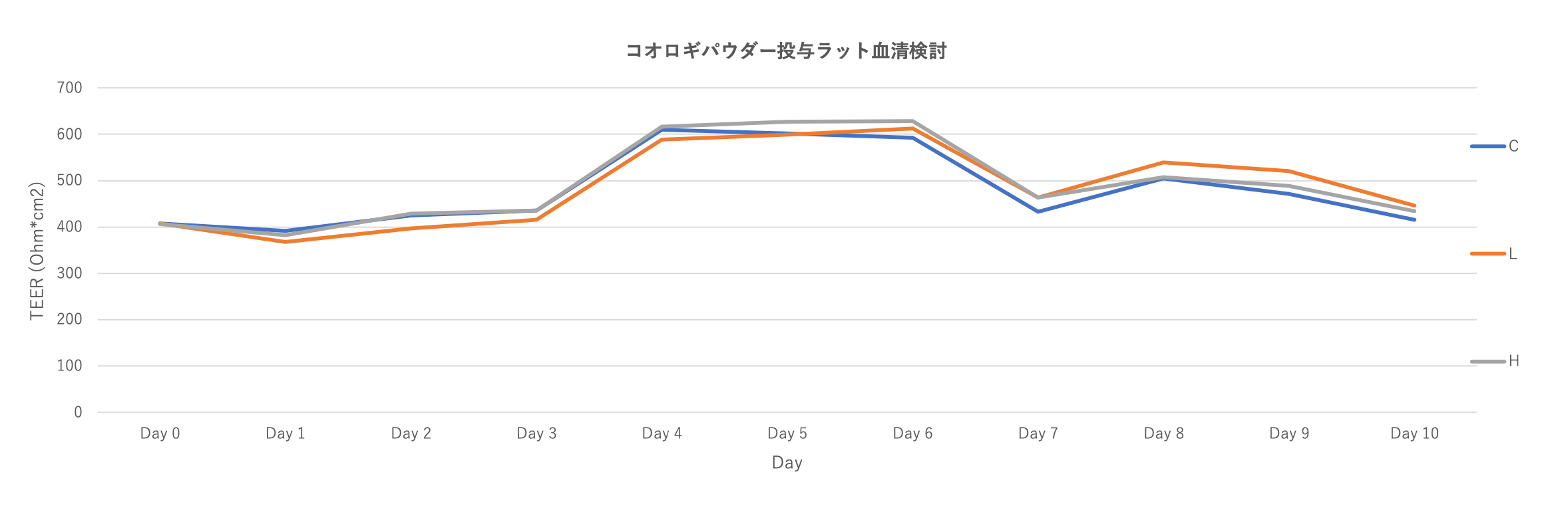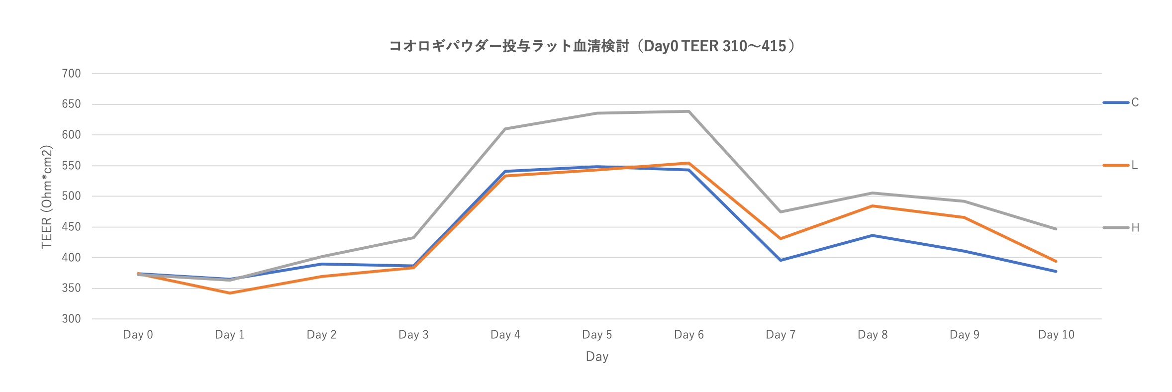 コントロール群(C)、コオロギパウダー低用量摂取群(L)・高用量摂取群(H) のTEER平均値は次のグラフの通り