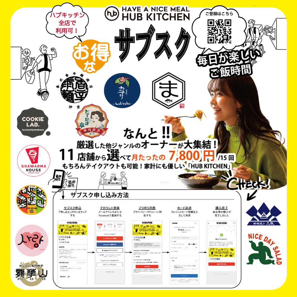 株式会社FTFが運営を行う【HUB KITCHEN】内にある”全ての店舗”で1日1回、ご飲食いただけるサービスとなっております。
