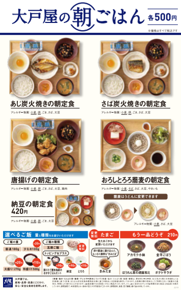 碧南市役所店では、通常メニューの他にも9:00~10:30の時間限定で「朝定食」を販売いたします。朝定食は全5種類。ワンコイン(税込500円)で大戸屋の定食が楽しめます。(※納豆の朝定食はなんと税込420円!!)