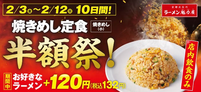 そこで、ラーメン魁力屋よりお客様に日頃の感謝の気持ちを込めて、「焼きめし定食半額祭」を2023年2月3日(金)~12日(日)の10日間限定で開催いたします。