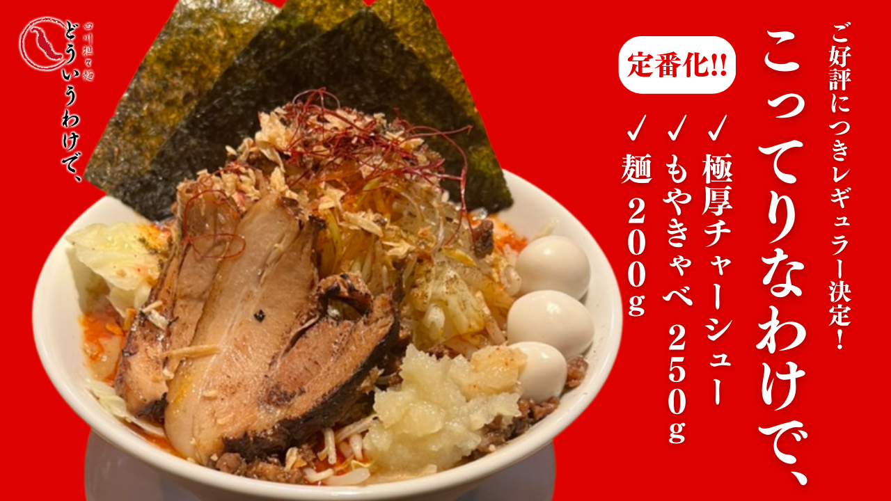 株式会社クロコ(本社:東京都中央区、代表取締役:田中貴紀)が運営する「四川担々麺 どういうわけで、(松戸市)」では、期間限定販売した超ボリューム満点なインスパイア系スペシャル担々麺「こってりなわけで、」がご好評につきレギュラー販売が決定しました。