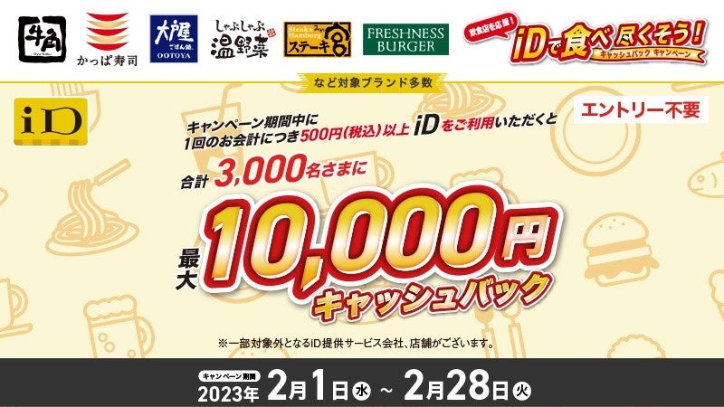 本キャンペーンは、牛角、かっぱ寿司、大戸屋、しゃぶしゃぶ温野菜、ステーキ宮、フレッシュネスバーガーをはじめとする、全国のコロワイドグループの対象店舗(計39ブランド)※にて、キャンペーン期間中1回のお会計につき500円(税込)以上を「iD」でお支払いいただいたお客さまを対象に、抽選で100名さまに10,000円分、400名さまに5,000円分、500名さまに1,000円分、2,000名さまに500円分のキャッシュバックをいたします。