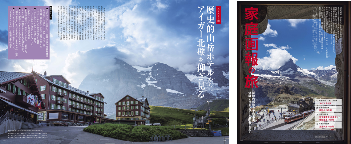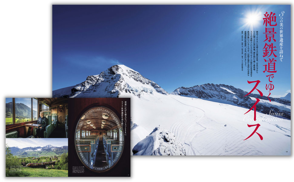 標高4000mを超える白銀の世界。中世の昔からつとに聞こえた知の聖地。湖を抱いて輝く葡萄畑。スイスの素晴らしいところは、そうした憧れの世界遺産を鉄道が繫いでいることです。目指す場所も道中の車窓も感動連続の鉄道旅へ、さあ、出かけましょう。また「家庭画報の旅」(株式会社プレミアム旅行社)では、ラグジュアリーなスイスツアーを企画しました。