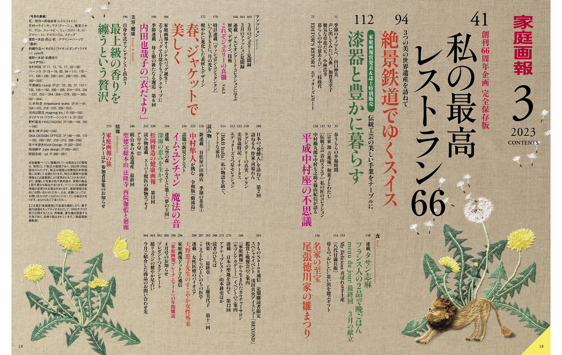 株式会社世界文化社は、創刊66周年記念号『家庭画報 3月号』を2月1日(水)に発売します。今号は「完全保存版 私の最高レストラン66」と題して、『家庭画報』ゆかりの著名人の 「人生の思い出に残る」美食処66軒を紹介します。また、「絶景鉄道でゆくスイス」では3つの世界遺産を巡り、雄大な自然と文化をダイナミックな写真でご紹介。連動企画としてスイスツアーもご用意しています。創刊66周年記念号にふさわしい特集満載でお届けします。