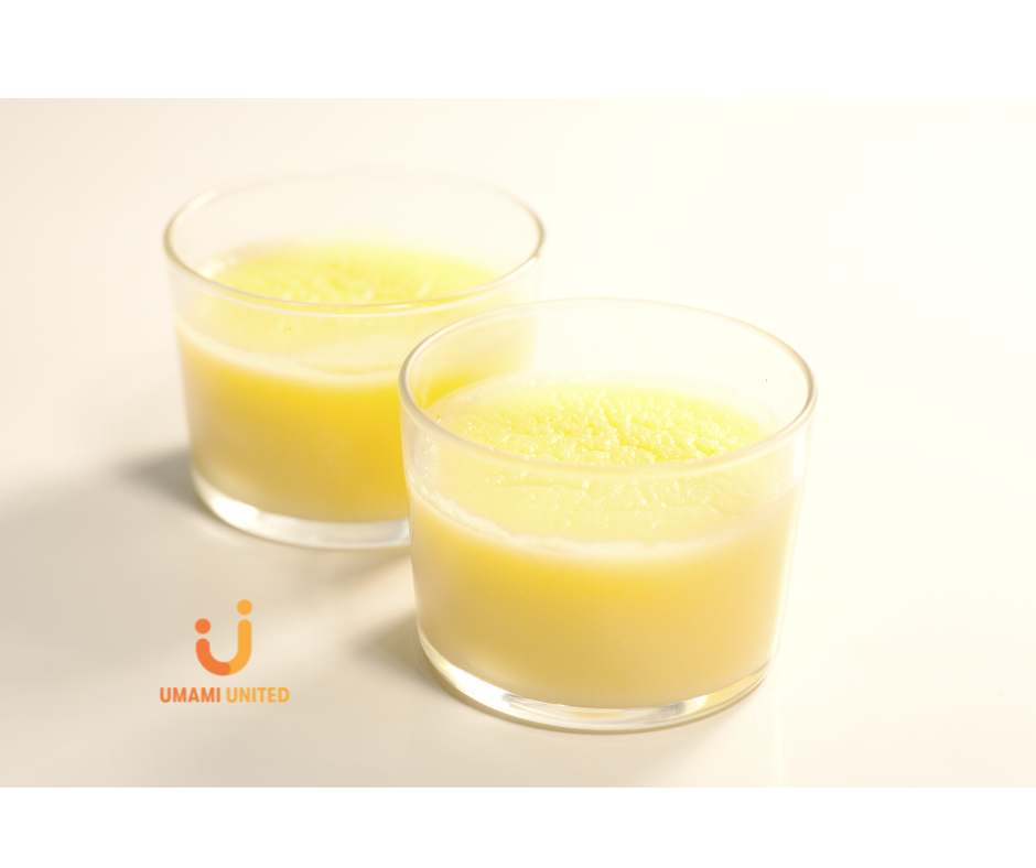 UMAMI EGGは卵単体の味わいやテクスチャーの表現だけではなく、卵がもつ機能に着目し、惣菜類はもちろん製菓分野にも使える幅広い汎用性を持った商品です。主原料には日本ならではの食材である「こんにゃく粉」や「にがり」を使用し、こんにゃくの弾力性や豆腐の割れる食感で卵らしさを表現しました。またフードロスのきくらげから発酵技術を応用した麹菌等の酵素を使用してUMAMIを抽出し、卵のコクを表現しました。