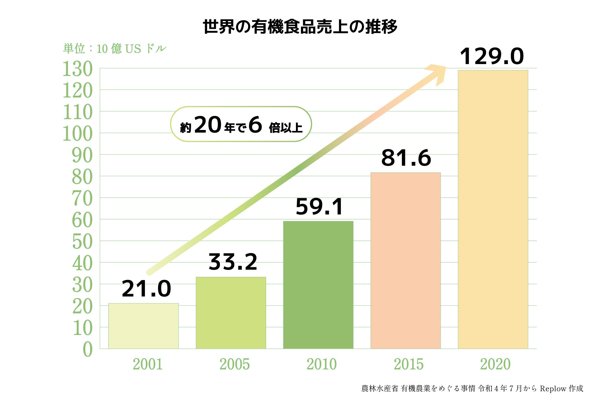 さらに、世界の有機食品売上は年々増加し続けており、2001年から2020年の間に6倍以上に拡大しています。
