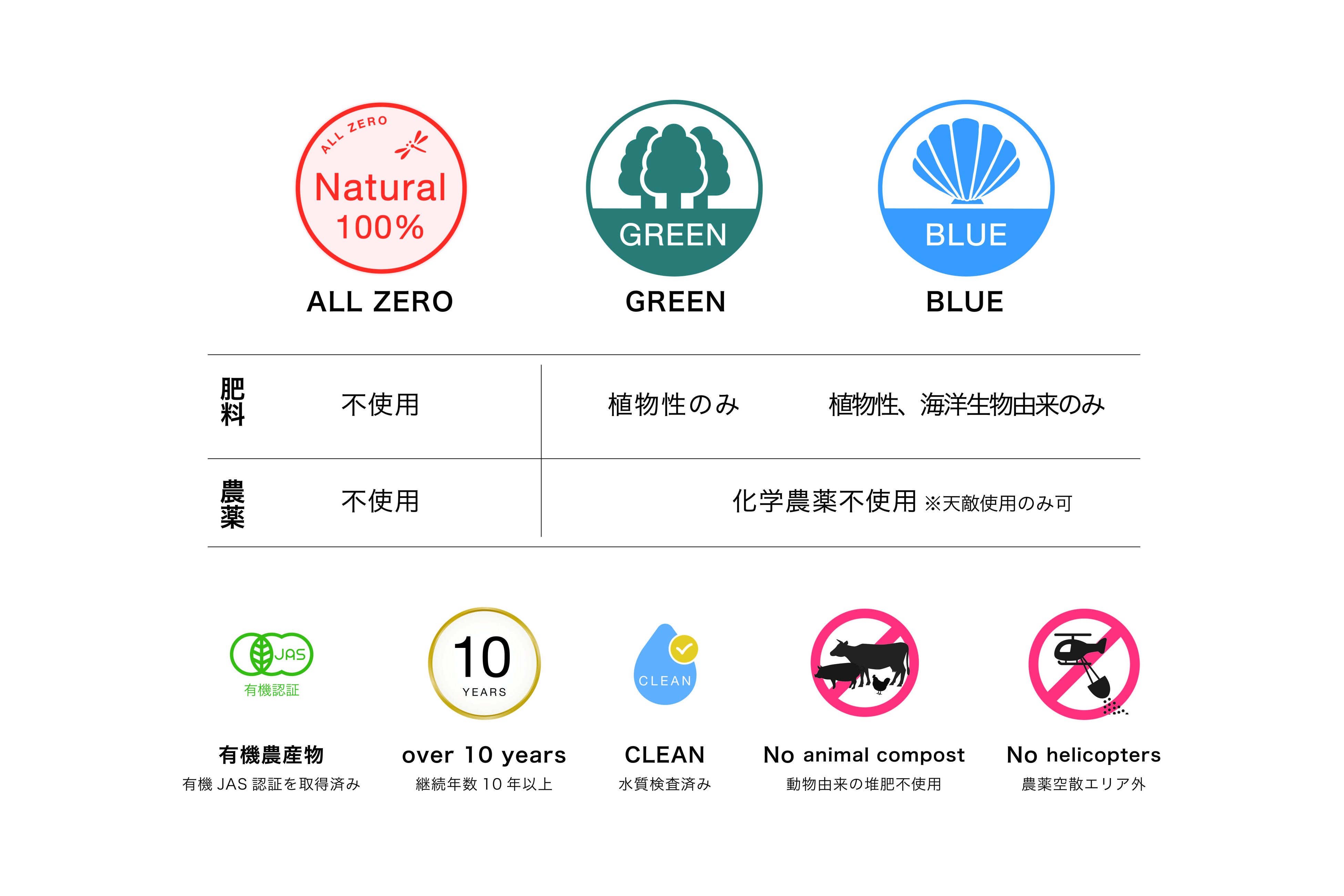 なにも与えない「ALL ZERO」、稲藁や籾殻などの植物性肥料のみを投入する「GREEN」、魚や海藻由来の堆肥などを投入する「BLUE」の3つに分類し、その生産方法を何年以上継続しているのかをビンテージウイスキーのように年数で表示しています。