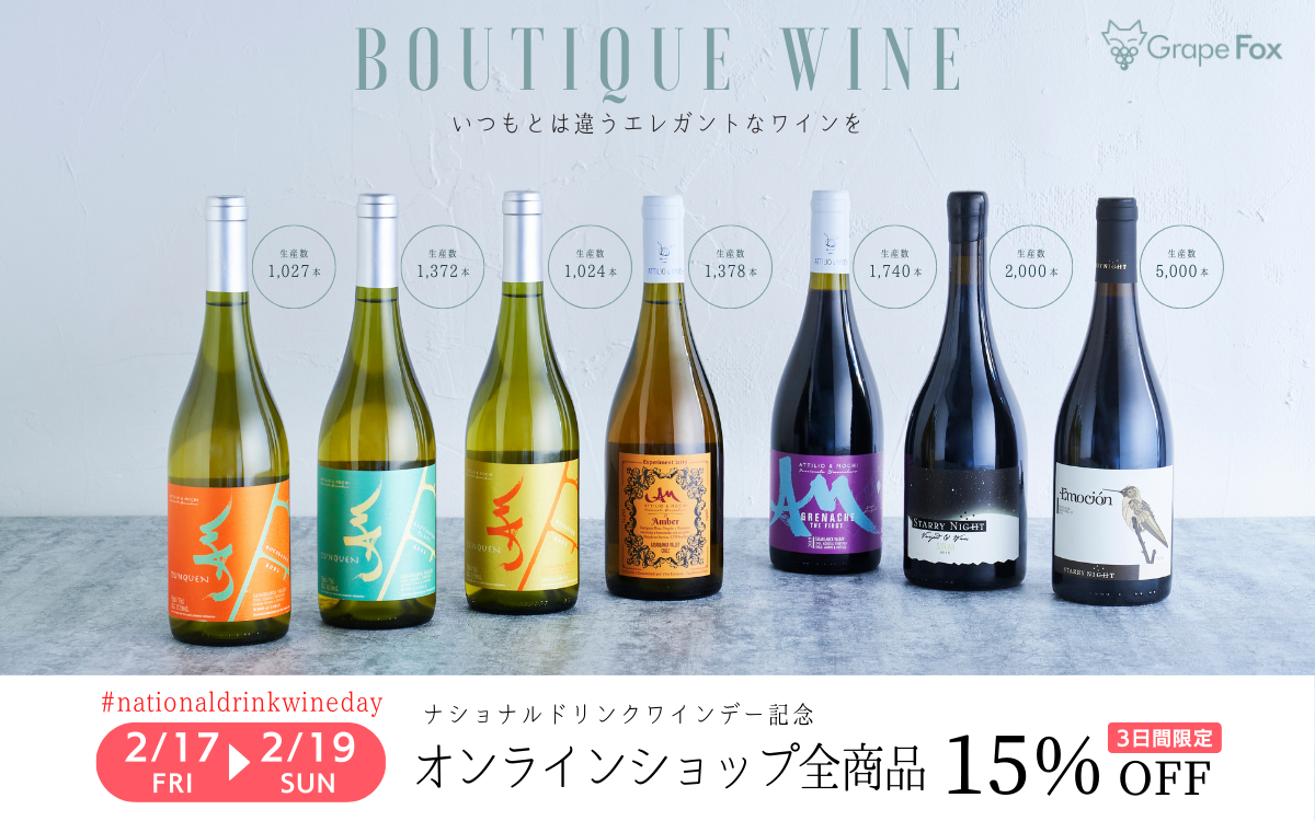 2月18日の「ナショナルドリンクワインデー」は主にアメリカで楽しまれているイベントで、「#nationaldrinkwineday」というハッシュタグとともにワインを楽しむ様子を投稿する新しいカルチャーが生まれています。日本ではまだまだ馴染みのないイベントですが、GrapeFoxではこの新しい習慣を記念し3日間限定でオンラインショップ全品15%オフのキャンペーンを実施いたします。すでに15%オフのセット商品にも適用いたしますので、最大30%オフになる大特価キャンペーンです。