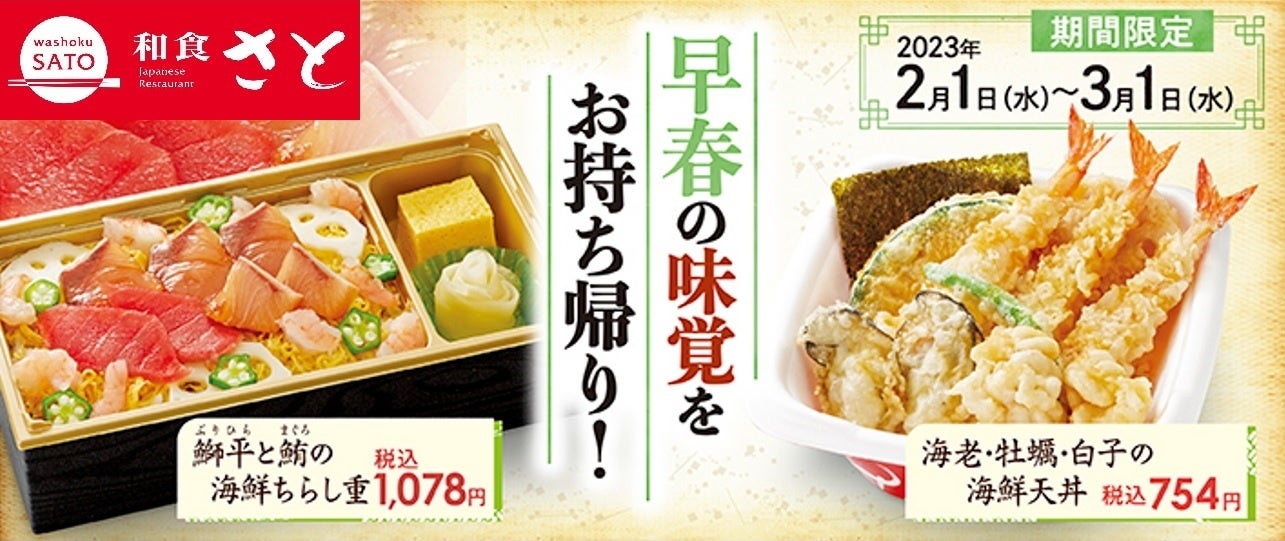 国内201店舗を展開する「和食さと」では、瀬戸内産の「牡蠣」や近畿大学水産研究所が開発したハイブリット魚種「鰤平(ぶりひら)」などを使った期間限定のテイクアウトメニューを、2月1日(水)から販売します。