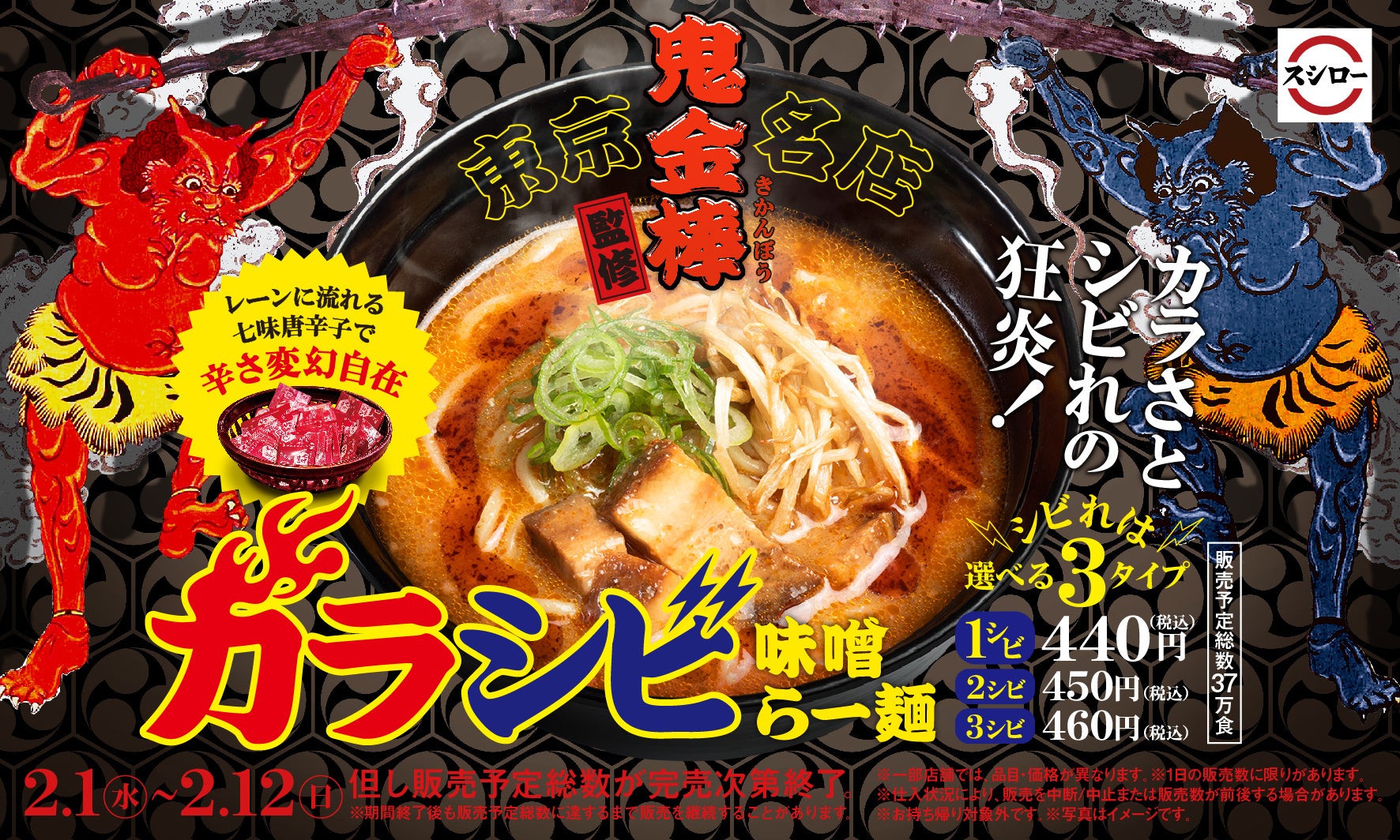 株式会社あきんどスシロー(本社:大阪府吹田市、代表取締役社長:新居 耕平)は、辛くてシビれる旨さの“カラシビ味噌らー麺”で人気を博す名店「鬼金棒」の監修商品として、「カラシビ味噌らー麺」を、2月1日(水)より全国のスシローにて期間限定で販売いたします。2月3日(金)の節分を前に“鬼”が注目されるこの季節に、満を持して「鬼金棒」監修のこだわりのラーメンが登場いたします。