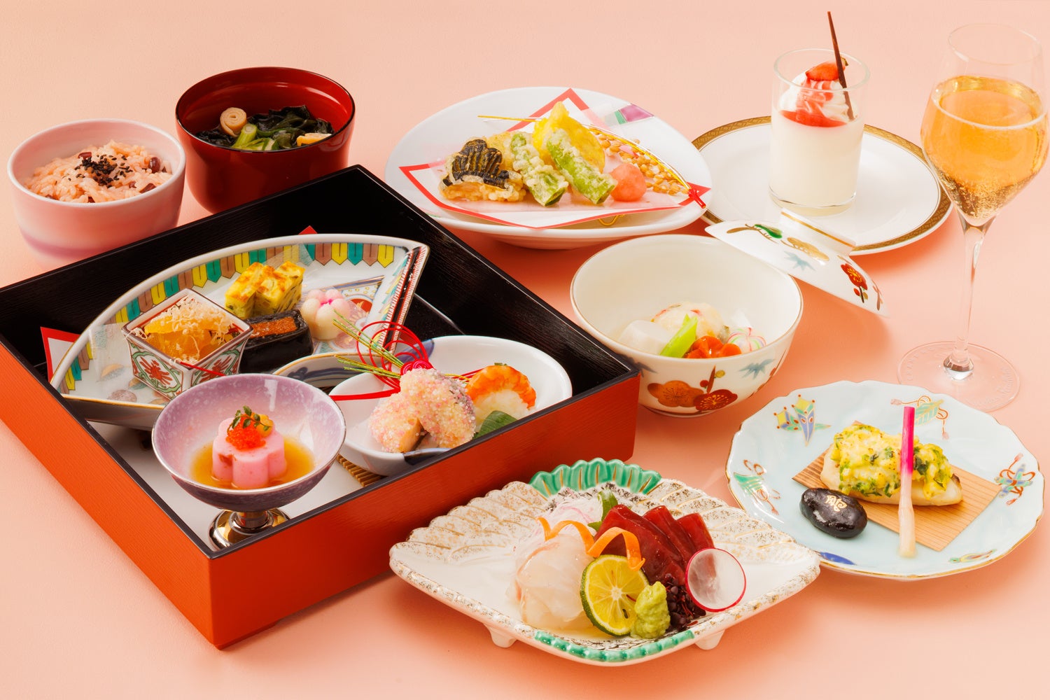 和食料理長 三上雅弘が手掛けるのは二膳仕立ての「春のお祝い御膳 慶 –よろこび–」と贅沢な7品からなる「春のお祝い会席 鶴 –つる–」。桜の花に見立てた桜胡麻豆腐や、菜の花の芽吹きを表現した穴子の菜種焼き、新緑をイメージしたサーモンの若草焼きなど、春を連想させる繊細な品々が随所にちりばめられています。
