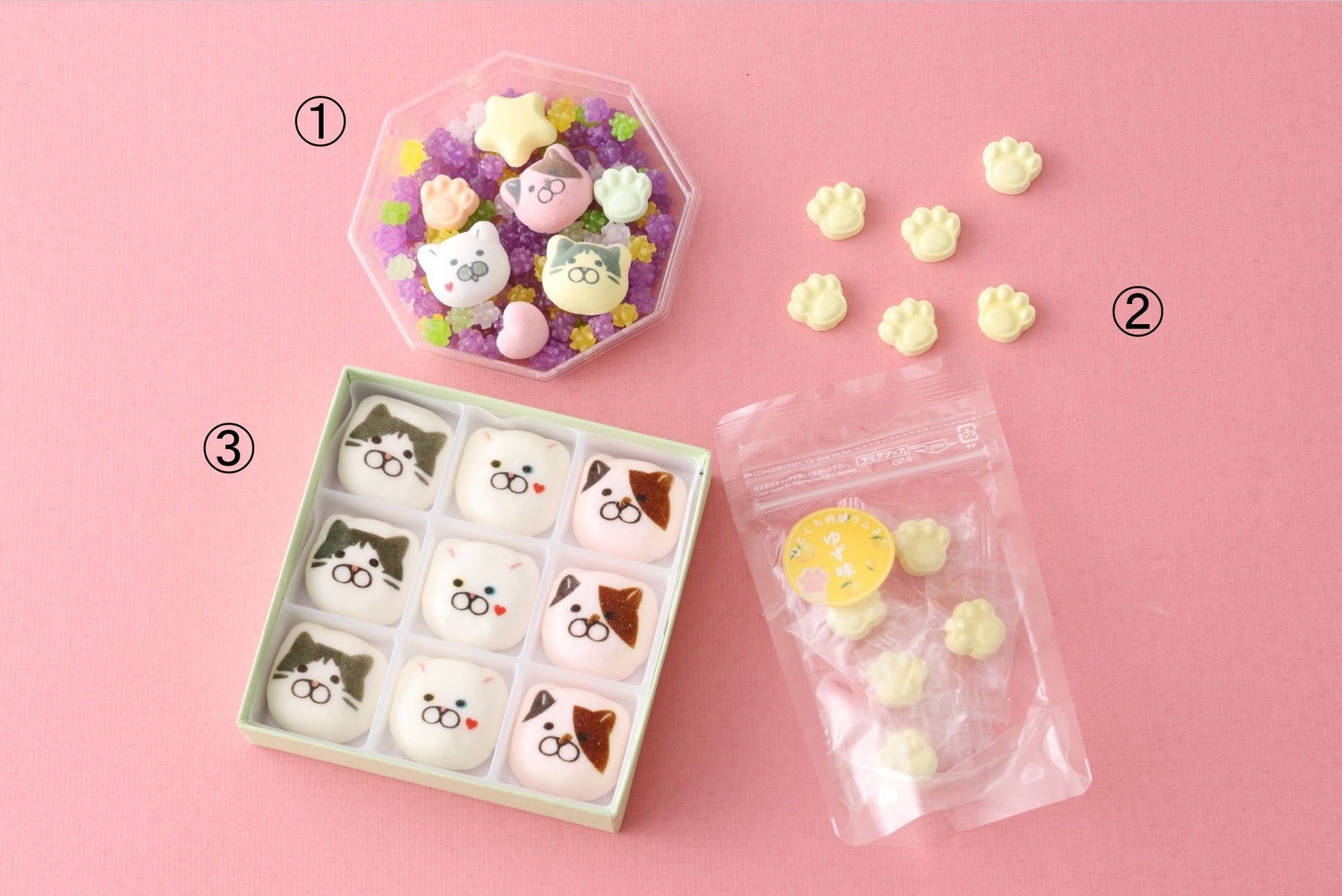 ねこのお顔が描かれたキュートなラムネや肉球ラムネ、寒天を使った和風マシュマロなど美味しさと可愛さがギュッと詰まったお菓子です。