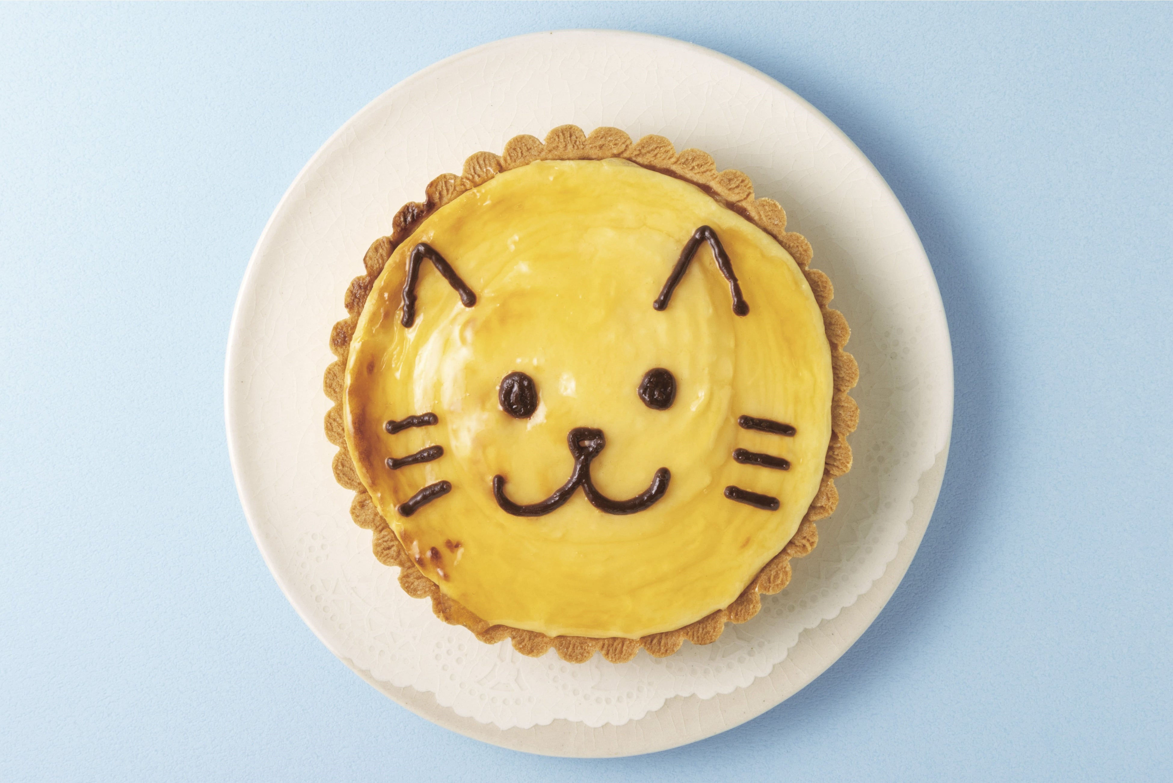 人気商品の店内で焼き上げたミルクチーズタルトに可愛い猫のイラストが入りました。