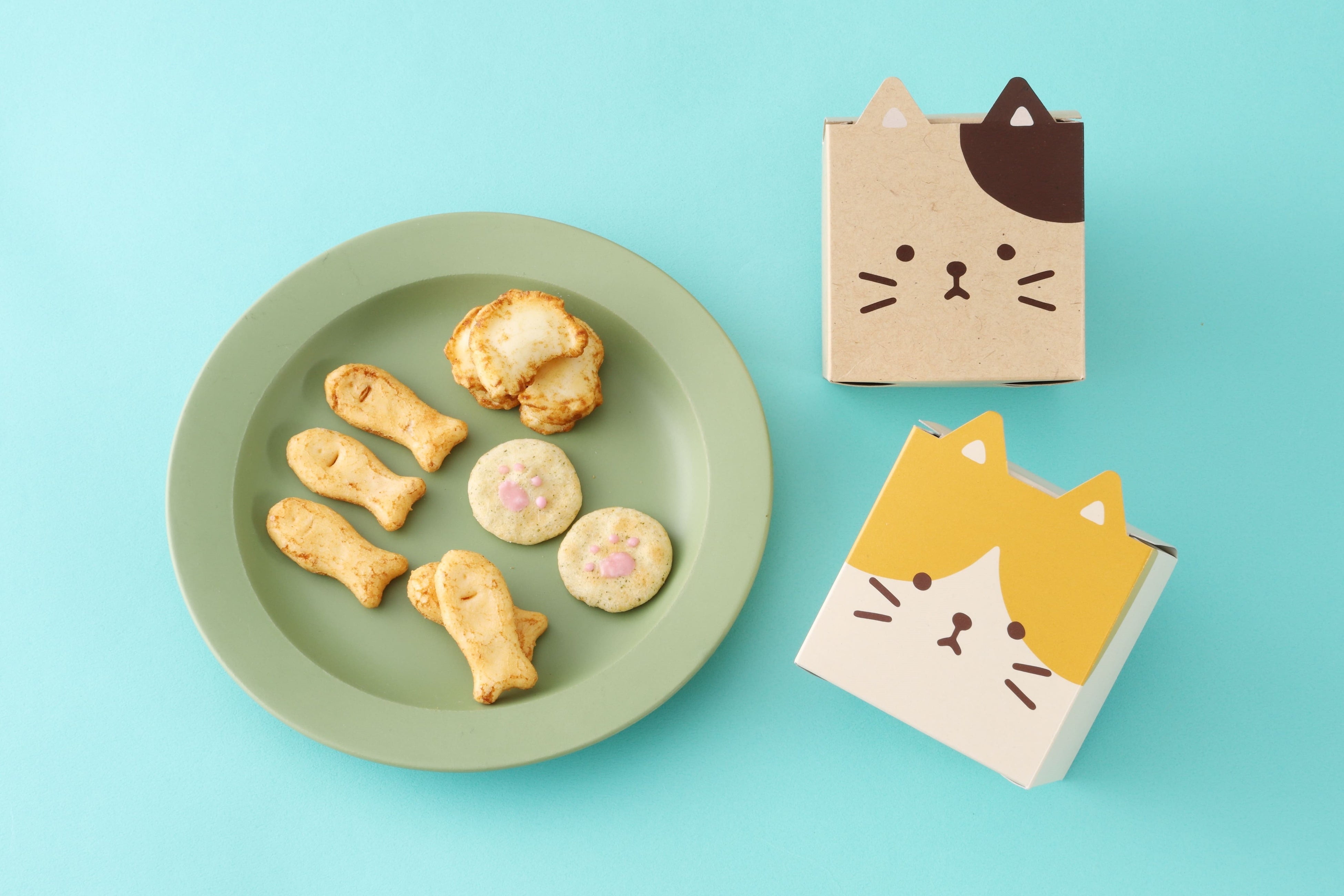 猫にちなんで古乃端かつお節、魚せんべい、小丸せんべい肉球の入った可愛い香ばしいおせんべいのセットです。