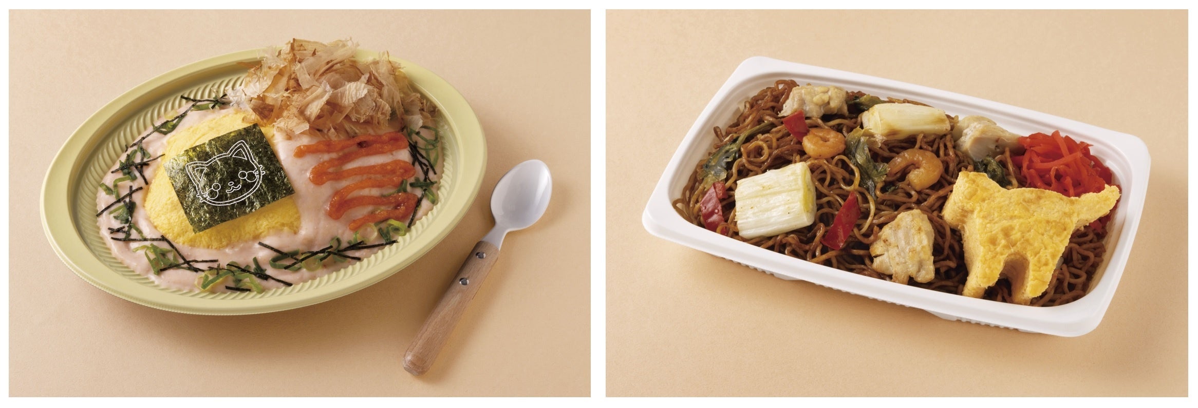 人気の焼きそばに猫型に仕上げただし巻き玉子と焼鳥にも使用している鶏肉とネギを合わせました。
