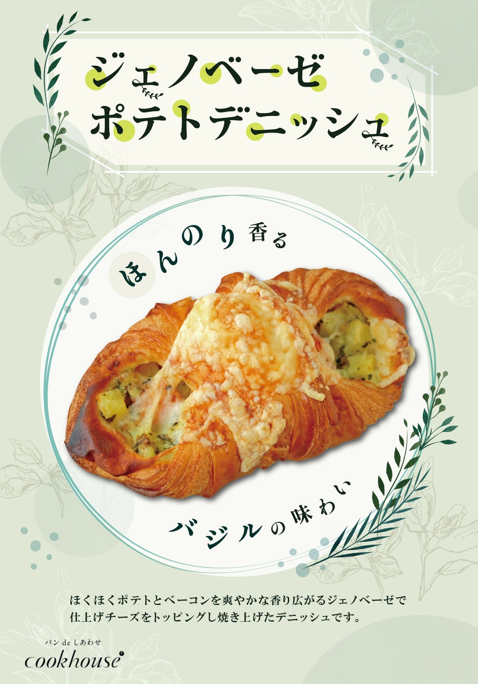 ほくほくポテトとベーコンを爽やかな香り広がるジェノベーゼで仕上げチーズをトッピングし焼き上げたデニッシュです。朝食にもお酒のお供にもピッタリです。