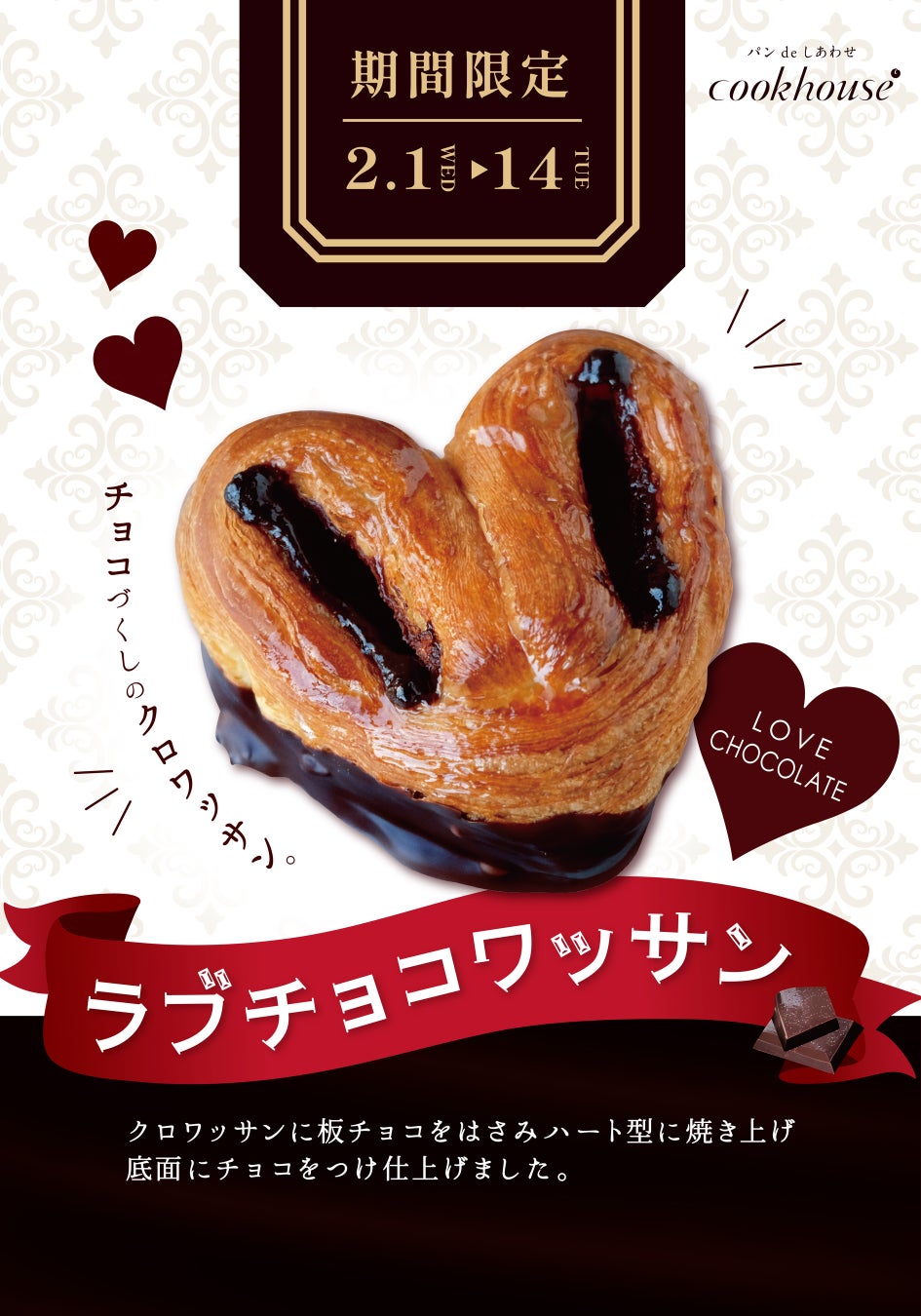 クロワッサンに板チョコをはさみハート型に焼き上げ底面にチョコをつけ仕上げました。