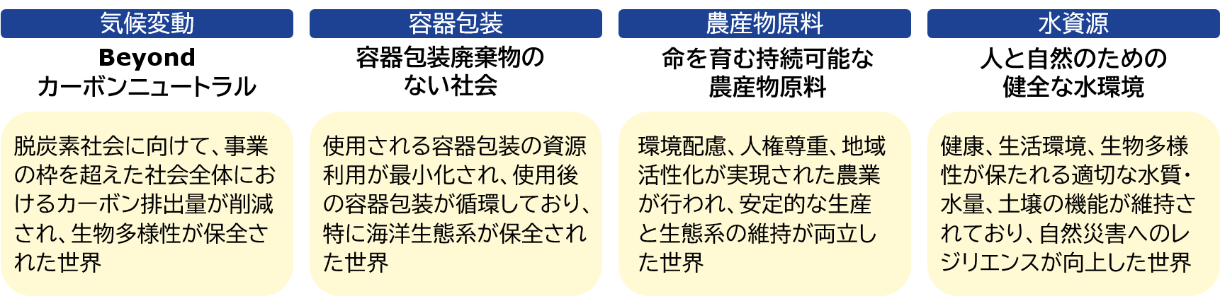 本環境ビジョンでは、環境への取り組みの4つの柱である「気候変動」「容器包装」「農産物原料」「水資源」において、2050年の世界のありたい姿を定義し、それぞれの実現に向けたアサヒグループとしての施策を推進します。