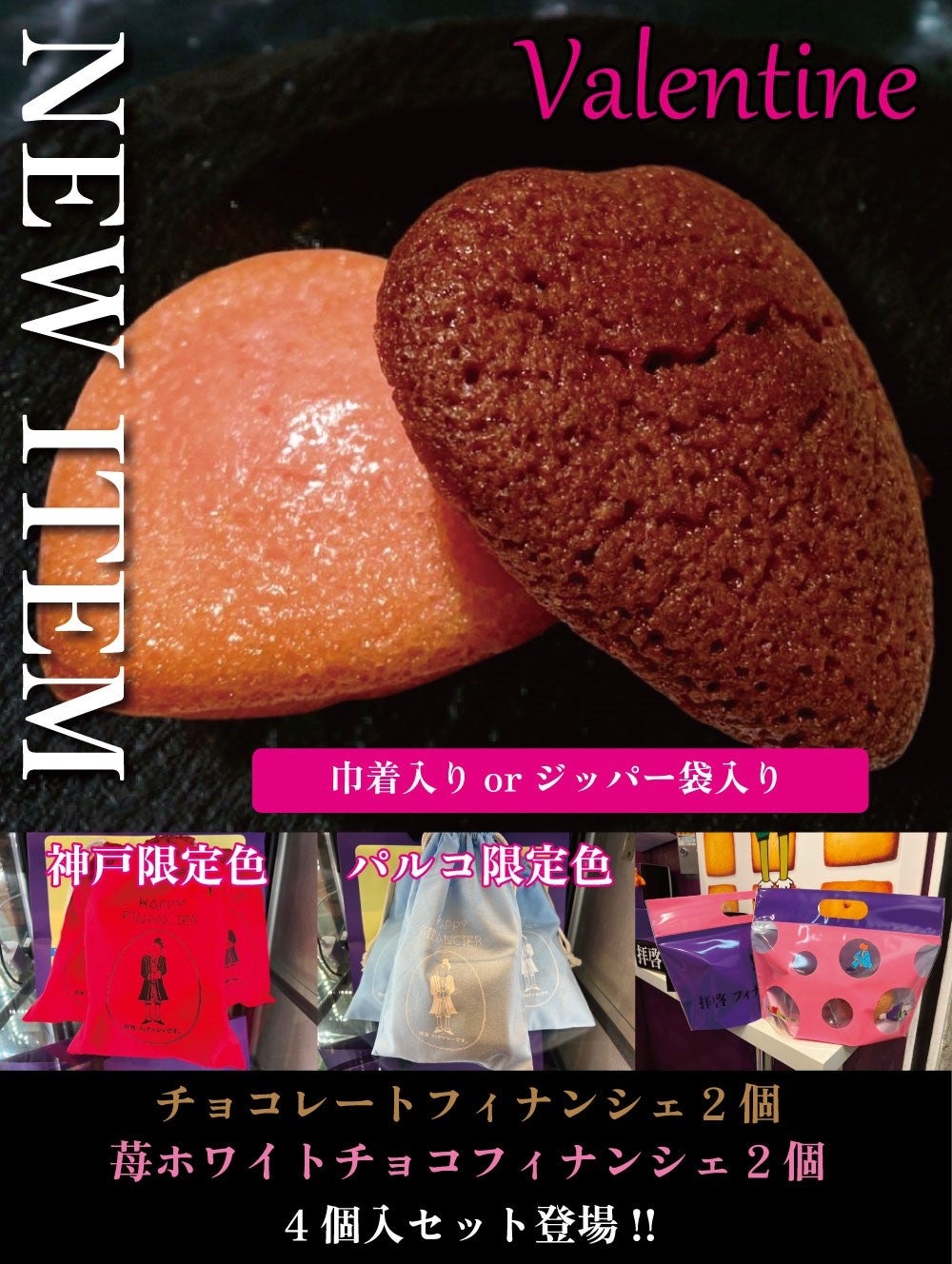⇒ハートが可愛い♪チョコレートフィナンシェ2個&苺ホワイトチョコフィナンシェ2個《4個入り》セットの販売開始!《神戸限定色》赤・《パルコ限定職》水色巾着orジッパー袋登場!