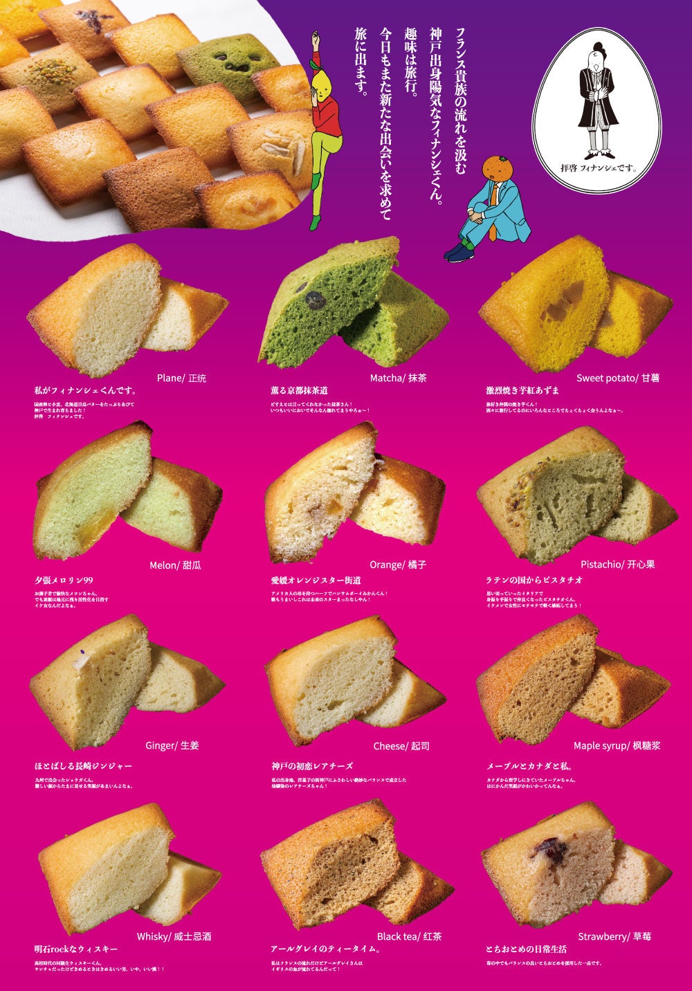 『フランス貴族の流れを組む神戸出身フィナンシェくんが、旅先での出会いを元に新しい味を生み出していく。』というストーリー仕立ての新商品開発も話題の一つ。