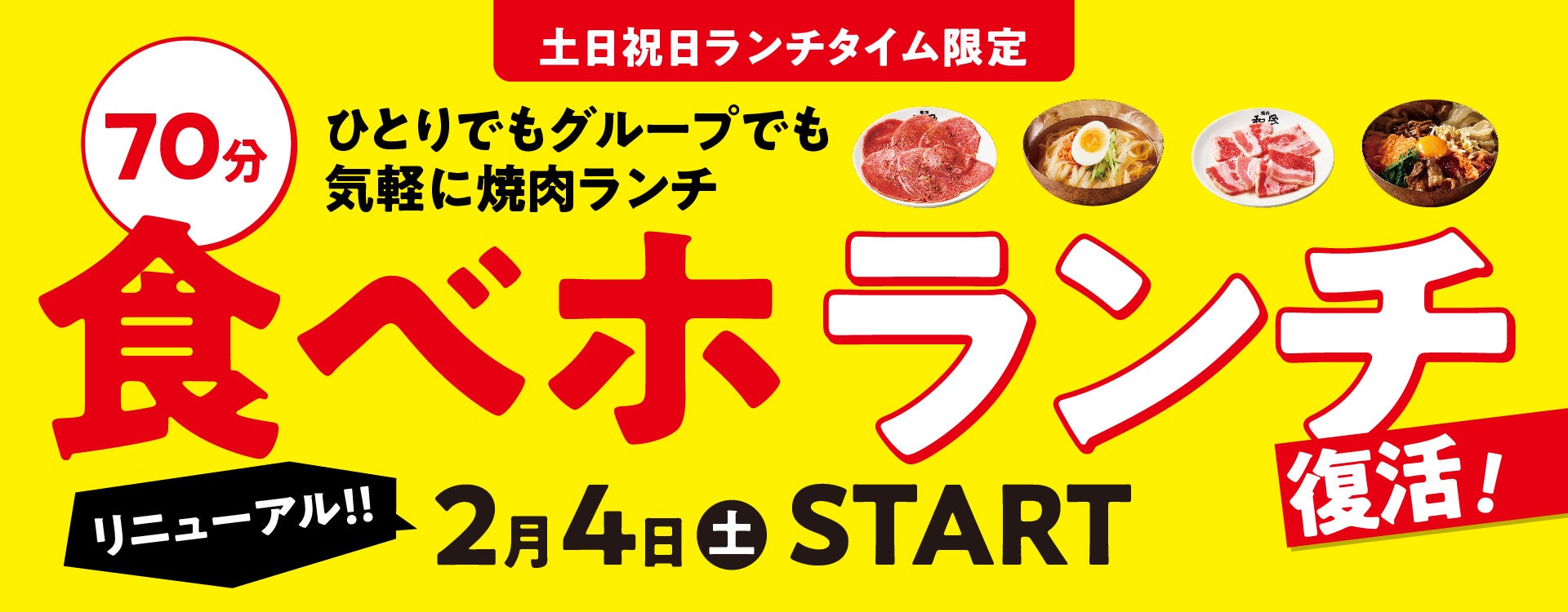 ワタミ株式会社(本社:東京都大田区、以下ワタミ)が全国で展開する、高品質な焼肉をリーズナブルな価格で提供する「焼肉の和民」は、土日祝日ランチタイムに販売しておりましたおひとり様1,980円(税込2,178円)の焼肉食べ放題「食べホ ランチ」プランを、大好評につき2023年2月4日(土)から時間を70分へ変更して全25店舗で復活販売いたします。