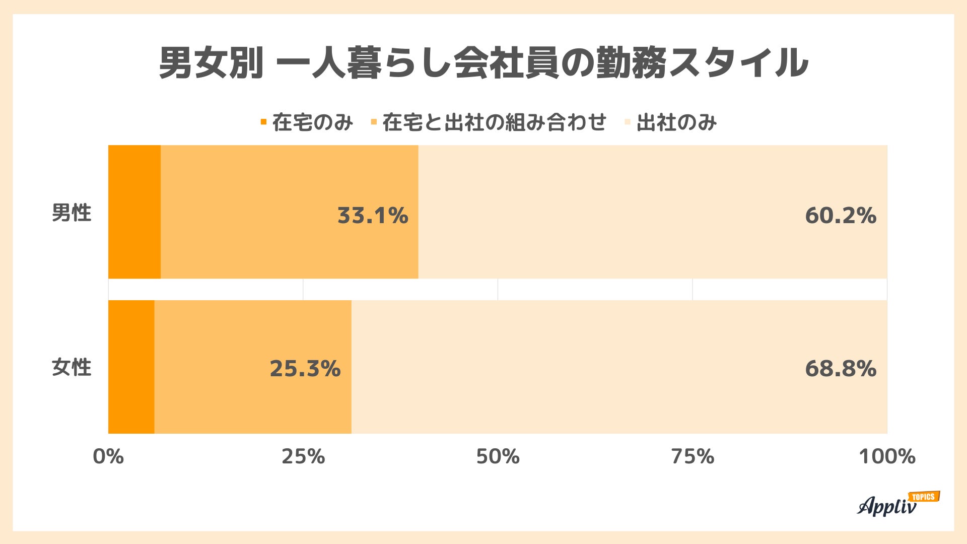 男女別に割合を比較すると、わずかに女性の方が出社割合が大きいです。