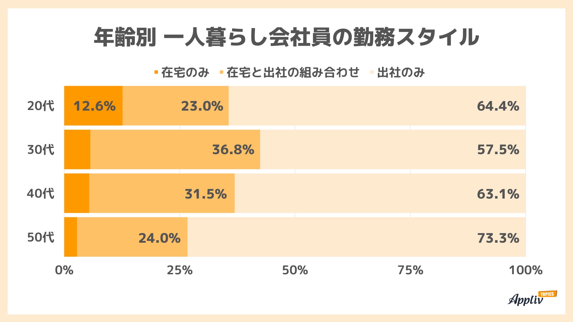 在宅勤務と出社を組み合わせている割合は30~40代が大きく、「出社のみ」が最も多いのは50代でした。