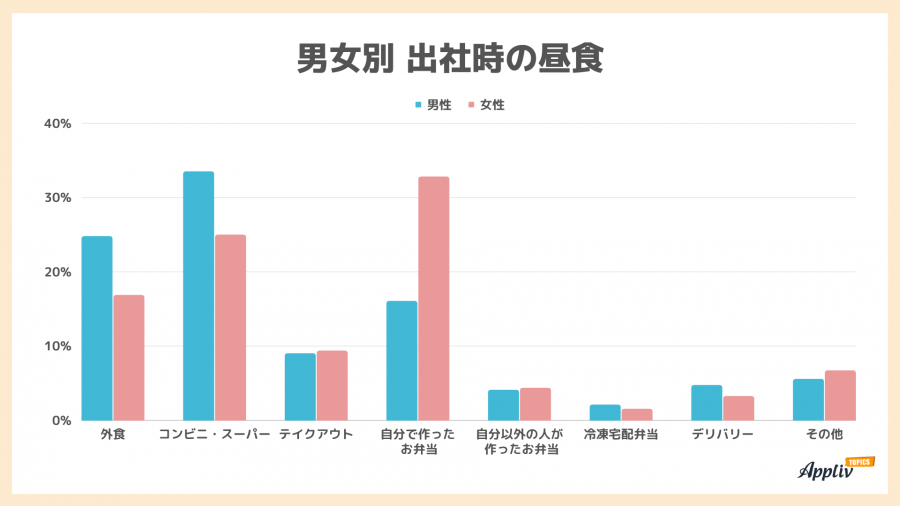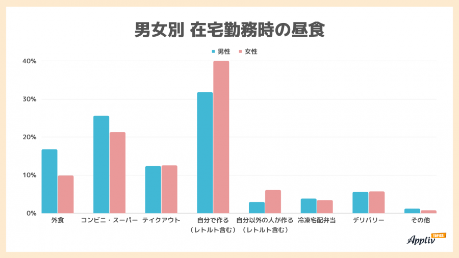 男女別で回答の割合を見てみると、「自分で作ったお弁当」が女性32.8%、男性16.1%と大きく差が出ているのが特徴的。これは在宅勤務時の「自分で作る(レトルト含む)」よりも、開きが大きいです。