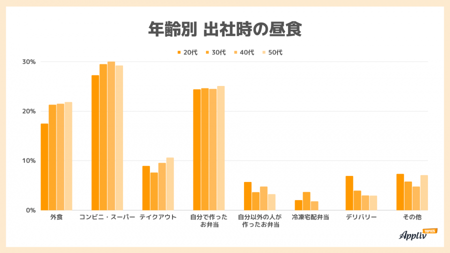 年齢別での回答の割合は、20代の「外食」「コンビニ・スーパー」が他年代よりも少し小さめ。反対に「デリバリー」の20代の割合が大きいです。ですが、在宅勤務時に比べて年齢による違いは小さいようです。