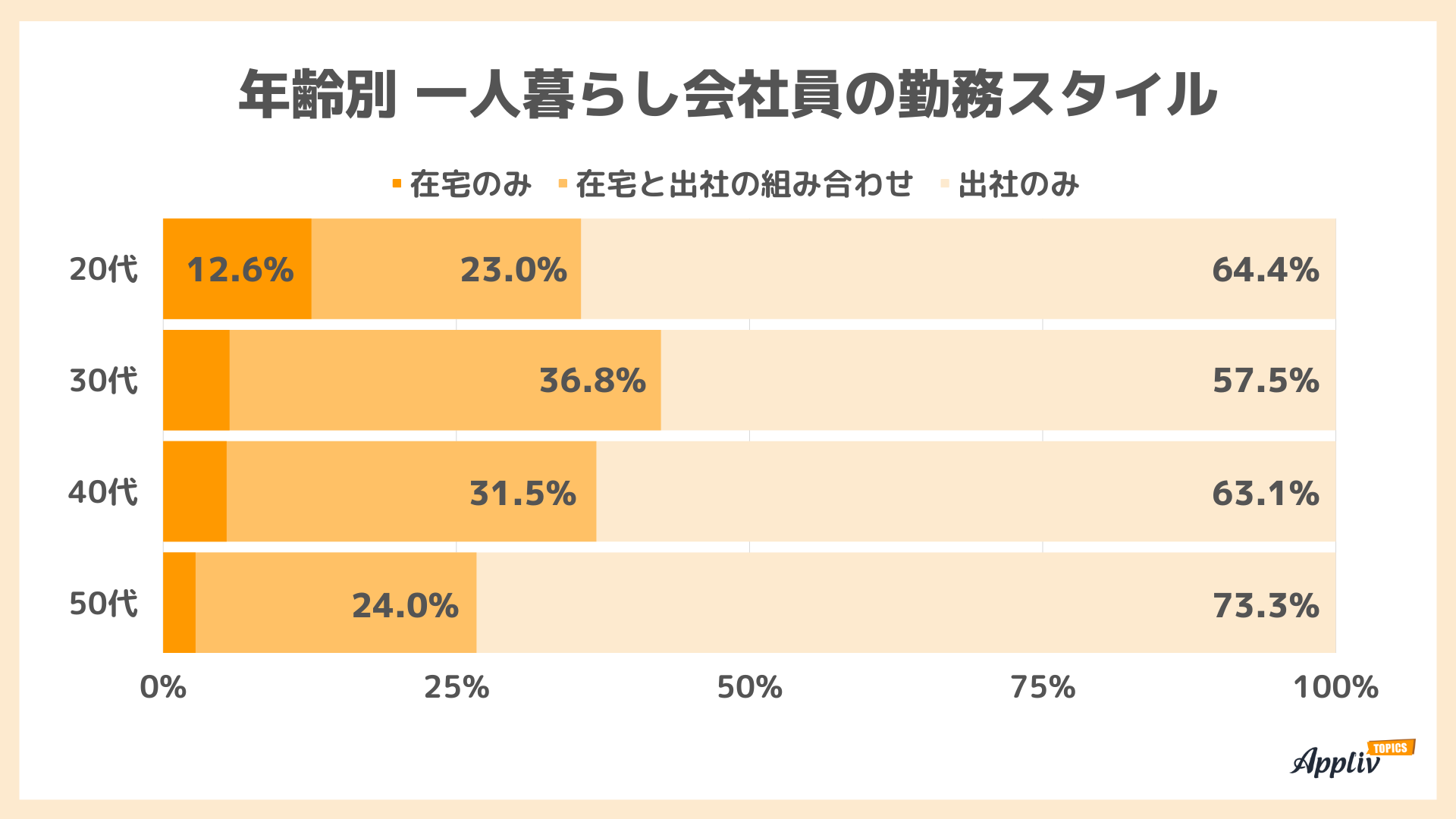 在宅勤務と出社を組み合わせている割合は30~40代が大きく、「出社のみ」が最も多いのは50代でした。