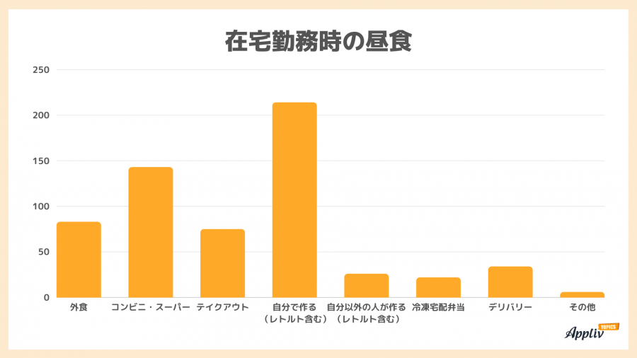 - 在宅勤務時の昼食は「自分で作る(レトルト含む)」が最多。
