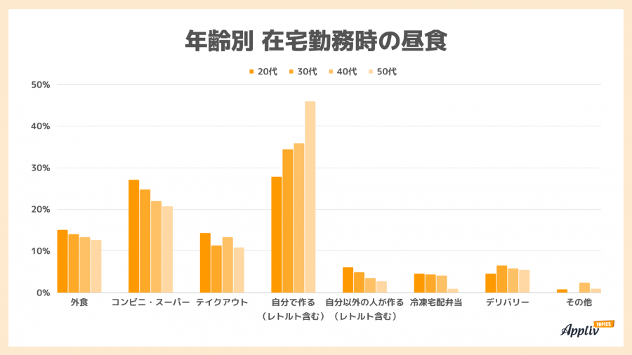 ■在宅勤務時の昼食は「自分で作る」が最多、若い人ほどコンビニや外食の利用が多い傾向