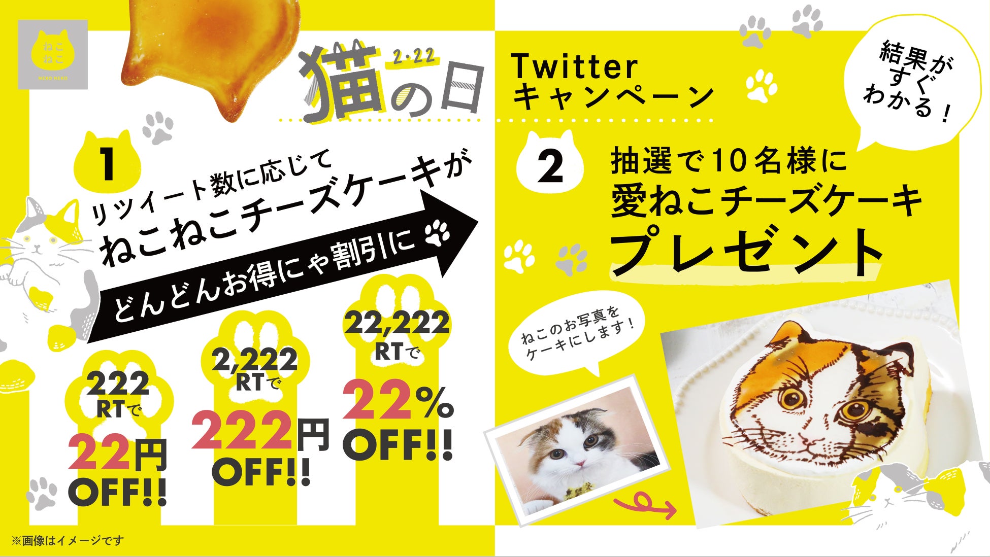 内容:キャンペーンツイートのリツイート数に応じて、2022年2月22日(水)~2022年2月28日(火)の期間中、店舗にて「ねこねこチーズケーキ」のお得なセールを実施いたします。