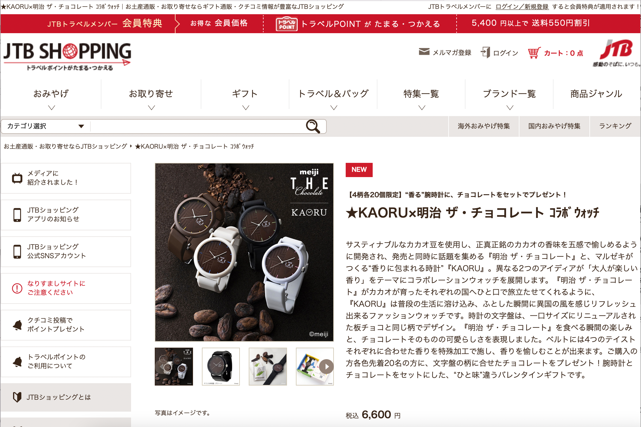 オンラインストア「JTBショッピング」にて発売している、KAORU x 明治 THE Chocolateコラボレーションウォッチ。各20個まで限定で、それぞれのモデルの元になったカカオの明治 THE Chocolateが1つプレゼントされる、バレンタインキャンペーンを実施しています!