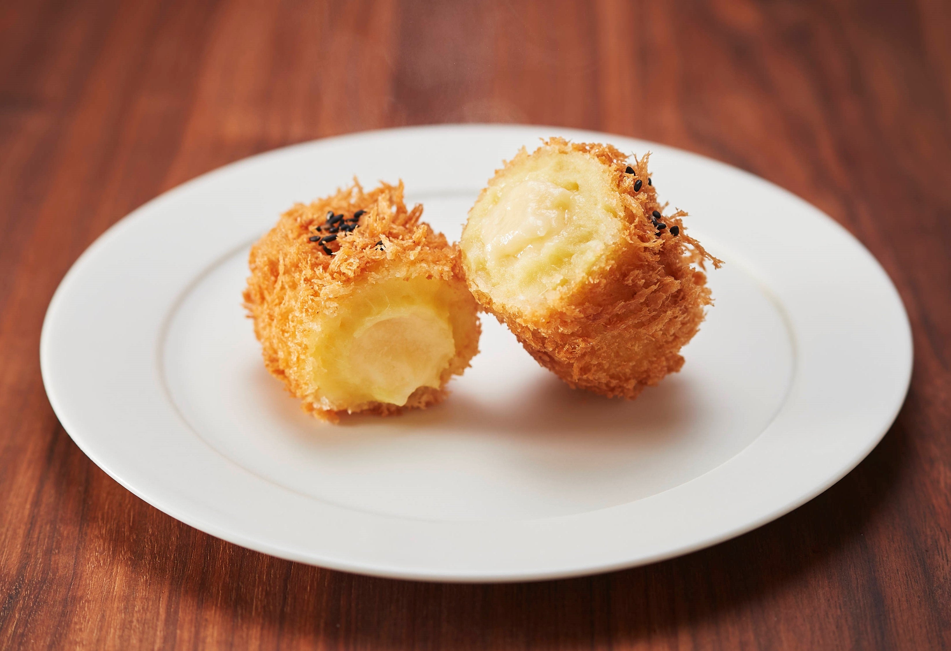 しっとりとしたさつまいもベースには「紅はるか」を使用。中からなめらかな「はちみつ塩バターソース」がとろけ出すあま~いコロッケ。はちみつバターには、ほんのり塩味を効かせています。